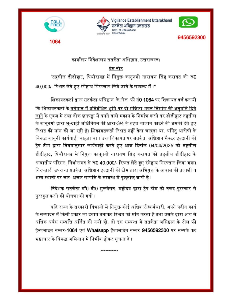 उत्तराखण्ड सतर्कता अधिष्ठान ने एक अहम कार्रवाई करते हुए तहसील डीडीहाट, पिथौरागढ़ में नियुक्त कानूनगो नारायण सिंह करायत को ₹40,000 की रिश्वत लेते हुए रंगेहाथ गिरफ्तार किया है। यह कार्रवाई सतर्कता अधिष्ठान सैक्टर हल्द्वानी की ट्रैप टीम द्वारा की गई।