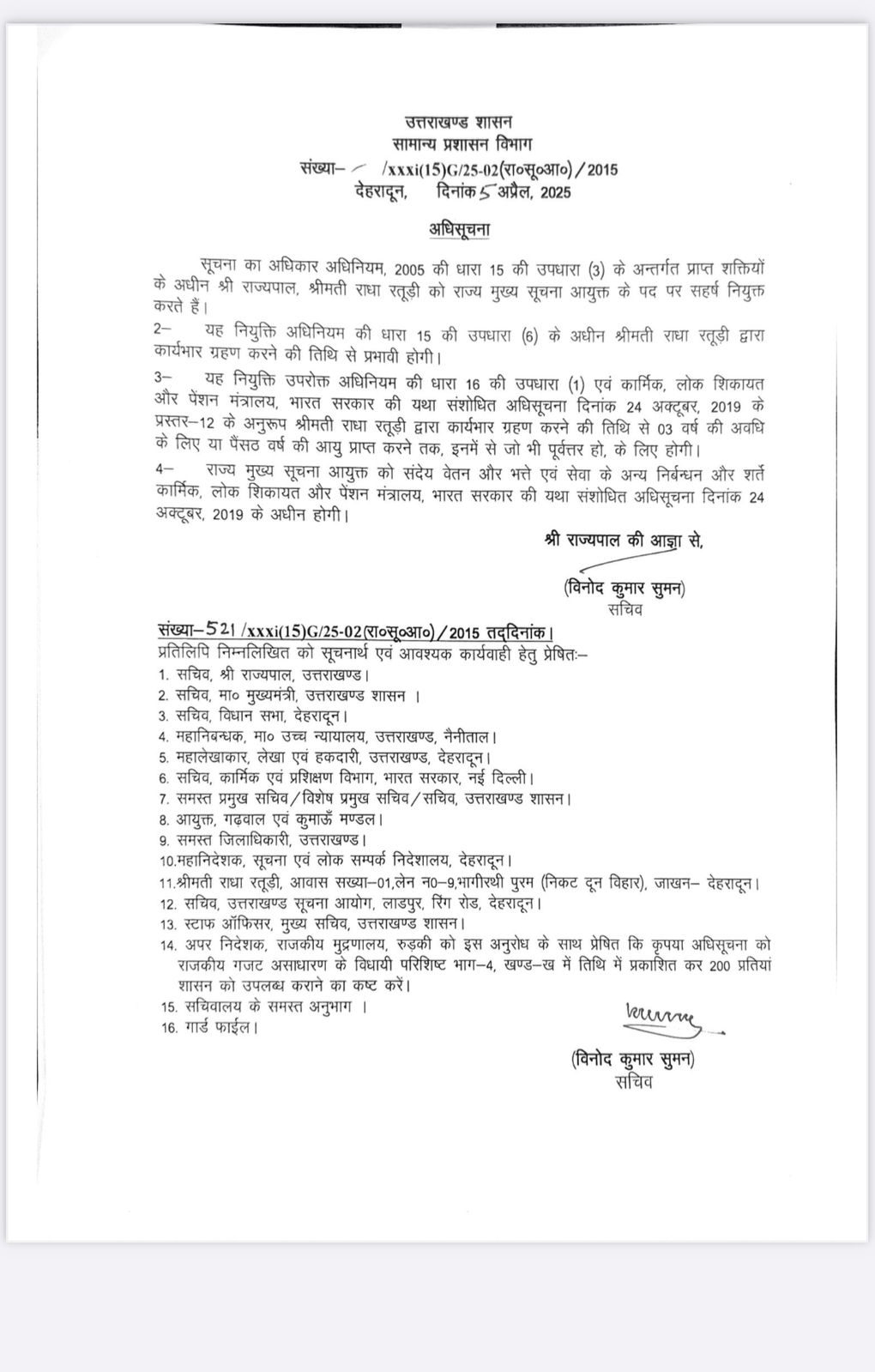 उत्तराखण्ड शासन ने सूचना का अधिकार अधिनियम, 2005 की धारा 15(3) के अंतर्गत बड़ी प्रशासनिक नियुक्ति की है। राज्यपाल के आदेशानुसार श्रीमती राधा रतूड़ी को राज्य मुख्य सूचना आयुक्त के पद पर नियुक्त किया गया है।