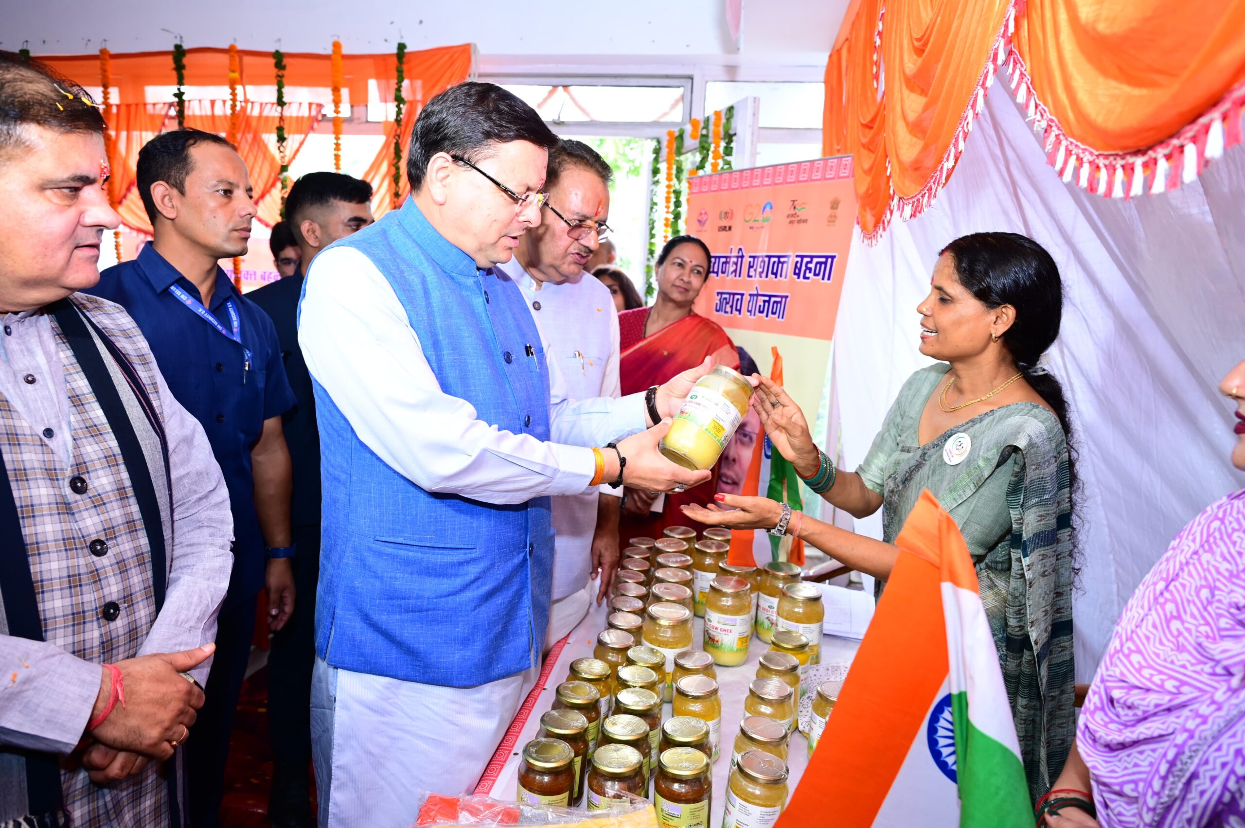 मुख्यमंत्री पुष्कर सिंह धामी ने सोमवार को सचिवालय में मुख्यमंत्री सशक्त बहना उत्सव योजना एवं मुख्यमंत्री महिला स्वयं सहायता समूह सशक्तिकरण योजना के अन्तर्गत महिला समूहों द्वारा लगाए गए स्टॉलों का शुभारंभ किया। इस अवसर पर मुख्यमंत्री ने इन स्टॉलो का अवलोकन करते हुए स्थानीय उत्पादों ( घी एवं अन्य) की खरीदारी भी की।