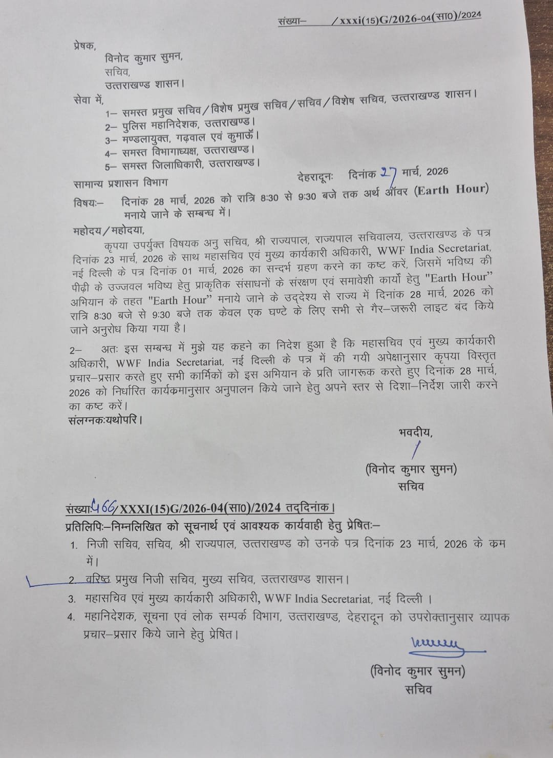 उत्तराखण्ड शासन ने 28 मार्च, 2026 को रात्रि 8:30 बजे से 9:30 बजे तक ‘अर्थ ऑवर (Earth Hour)’ मनाने का निर्णय लिया है। इस दौरान प्रदेशवासियों से एक घंटे के लिए सभी गैर-जरूरी लाइटें एवं विद्युत उपकरण बंद रखने की अपील की गई है।
