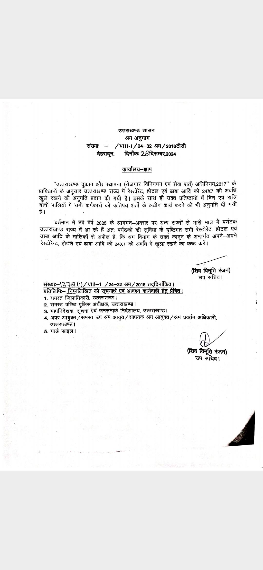 नव वर्ष 2025 के स्वागत के अवसर पर उत्तराखण्ड राज्य में पर्यटकों की भारी संख्या आने की संभावना है। इसको ध्यान में रखते हुए राज्य सरकार ने उत्तराखण्ड दुकान और स्थापना (रोजगार विनियमन एवं सेवा शर्त) अधिनियम, 2017 के तहत रेस्टोरेंट, होटल और ढाबों को 24X7 खुला रखने की अनुमति प्रदान की है। इस निर्णय से पर्यटकों को रात भर खानपान और अन्य सुविधाओं का लाभ मिलेगा, जिससे उनकी यात्रा अनुभव और बेहतर होगा।