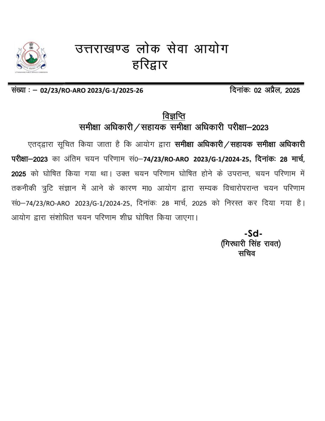 हरिद्वार: उत्तराखंड लोक सेवा आयोग (UKPSC) ने समीक्षा अधिकारी (RO) / सहायक समीक्षा अधिकारी (ARO) परीक्षा–2023 के अंतिम चयन परिणाम को तकनीकी त्रुटियों के कारण निरस्त कर दिया है। आयोग ने यह निर्णय 28 मार्च 2025 को घोषित परिणाम में आई खामियों को ध्यान में रखते हुए लिया है।